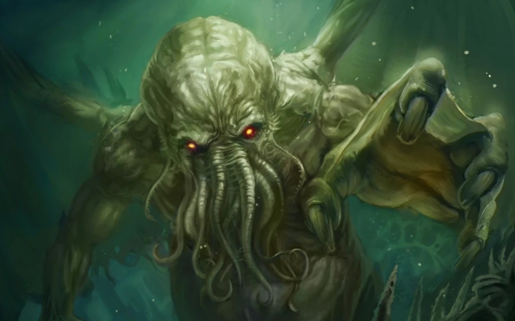 Lovecraft described Cthulhu as a massive, green entity with an octopus-like head, a scaly, humanoid body, prominent claws, and narrow wings. Cthulhu exists in a state of death-like sleep beneath the ocean in the submerged city of R’lyeh, located in the South Pacific. While dormant, the entity is said to exert a subconscious influence on humanity, contributing to anxiety and madness.
